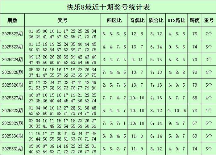 福彩愉快8第2025331期开奖纪念:05 06 07 08 14 18 22 23 25 31 40 52 59 63 71 72 73 76 77 79,其中奖号四区比为6:5:2:7,奇偶比为11:9,质合比为8:12,跨度为74,012路比为4:9:7,开出3个重号:31、63、71。