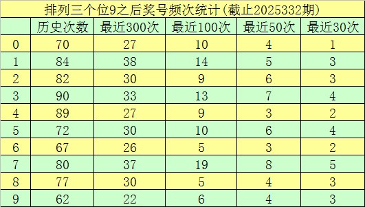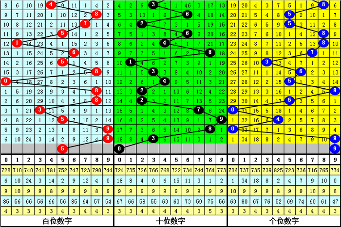 第一位杀号:上期第一位奖号为9,第一位奖号9历史上出现744次,前100次该位开出奖号9之后,下期号码0-9出现次数从高到底辩认为:号码9→15次,6、7→13次,5→11次,1、2、3→10次,8→7次,0→6次,4→5次。