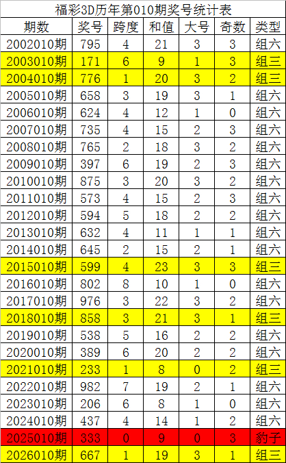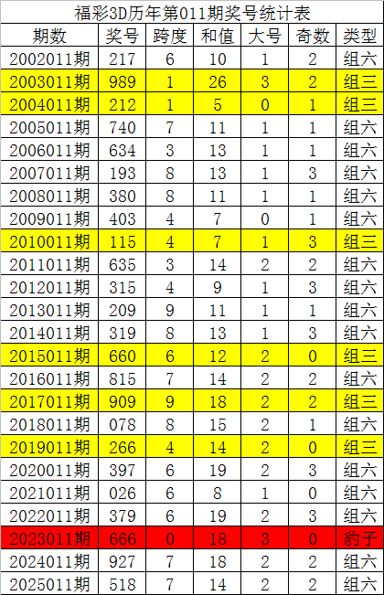 从以上统计不错看出,积年3D第011期开出了1次豹子号码,开出了6次组三号码,开出了17次组六号码。组六号码出现概率大,本期预测开出组六号码。
